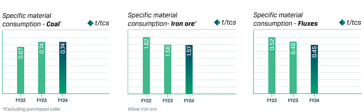 Earth has a limited supply of materials be it metal ores (aluminium, iron), minerals (limestone, chalk), precious metals (gold, silver), coke, coal, or even water. As the population continues to grow and technologically develop, demand for finite raw materials will only increase, resulting in greater competition between different industries. That is why improved efficiency in the use of raw materials is seen as key in ensuring our long-term capability to satisfy society’s ever-growing demand. In today’s dynamic and uncertain business environment, the key to achieving operational excellence lies in the effective management of resources. Being aware of the fact that efficient use of natural resources is critical to sustainability, JSW Steel is committed to responsible usage of resources and protection of the environment through innovative practices. In FY 24, our CapEx for environmental investments was INR 179 crores and OpEx for environmental investments was INR 854 crores. Further, estimated savings from environmental investments was INR 815 crores.