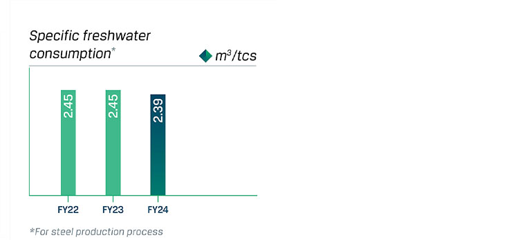 Setting clear, measurable targets is essential to our water efficiency efforts. These targets are regularly reviewed and adjusted to reflect changes in our operations and advancements in water-saving technologies. We are committed to reducing specific water consumption for production from ISPs to 2.21 m3/tcs by 2030.